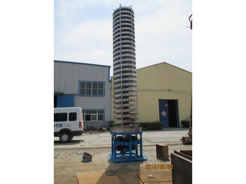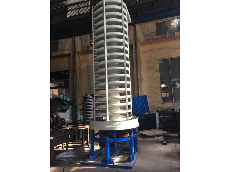 ZC系列垂直提升機(jī)的驅(qū)動(dòng)裝置振動(dòng)電機(jī)安裝在輸送塔下部,兩臺(tái)振動(dòng)電機(jī)對(duì)稱交叉安裝,輸送塔由管體和焊接在管體周圍的螺旋輸送槽組成,輸送塔座于減振裝置 上,減振裝置由底座和隔振彈簧組成。當(dāng)垂直提升機(jī)工作時(shí),根據(jù)雙振動(dòng)電機(jī)自同步原理,由振動(dòng)電機(jī)產(chǎn)生激振力,強(qiáng)迫整個(gè)輸送塔體作水平圓運(yùn)動(dòng)和向上垂直運(yùn)動(dòng) 的空間復(fù)合振動(dòng),螺旋槽內(nèi)的物料則受輸送槽的作用,作勻速拋擲圓運(yùn)動(dòng),沿輸送槽體向上運(yùn)動(dòng),從而完成物料的向上(或向下)輸送作業(yè),因此本設(shè)備也被成為振 動(dòng)垂直輸送機(jī)。